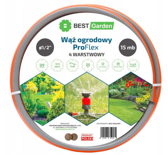 WĄŻ OGRODOWY 1/2” 15m PRO FLEX BEST GARDEN Wąż ogrodowy 4-warstwowy BEST Garden PRO FLEX wzmocniony oplotem krzyżowym oraz dodatkową warstwa wzmacniającą, charakteryzujący się wysoką elastycznością. Warstwa wewnętrzna zapobiega porastaniu glonów, a warstwa zewnętrzna odporna jest na promienie UV. Wąż wielosezonowy. Wyprodukowany w Polsce. Parametry techniczne: średnica: 1/2″ ciśnienie maksymalne: 25bar długość rolki: 15m Właściwości użytkowe: wąż 4-warstwowy dodatkowa wewnętrzna warstwa wzmacniająca wzmocnienie węża w oplocie krzyżowym oplot krzyżowy z przędzy poliestrowej wysokiej jakości wewnętrzna warstwa zapobiegająca porastaniu glonów wysoka elastyczność technologia zapobiegająca plątaniu się węża wąż wielosezonowy – efektywna praca w niskich i wysokich temperaturach zakres temperatur: od -10 do +60 stopni C odporny na promieniowanie UV przyjazny dla środowiska – nie zawiera w swoim składzie kadmu (Cd), ołowiu (Pb), baru (Ba)