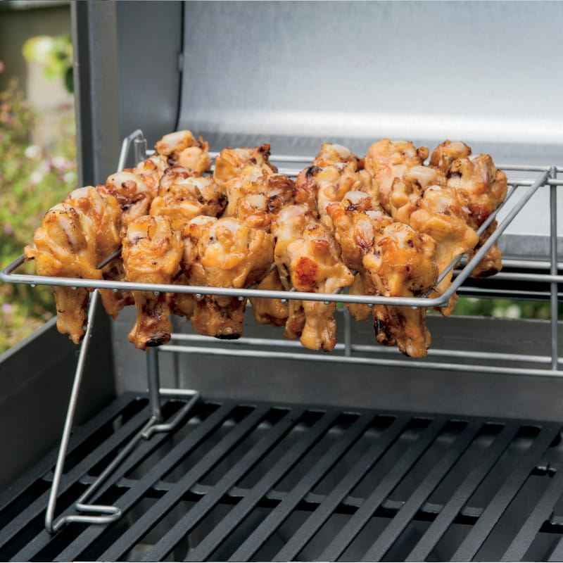 Ruszt do grillowania wielopoziomowego Elevations pozwala na jednoczesne przyrządzanie dania głównego i dodatków, a nawet tostowanie pieczywa. Wszechstronny ruszt rozszerza możliwości grilla, pełniąc funkcję dodatkowego rusztu, który pomieści do 1,5 kg jedzenia lub 25 pałek z kurczaka. Ruszt do grillowania wielopoziomowego mocuje się bezpośrednio na systemie grillowania wielopozionowego, aby zwiększyć pojemność głównego rusztu do pieczenia.