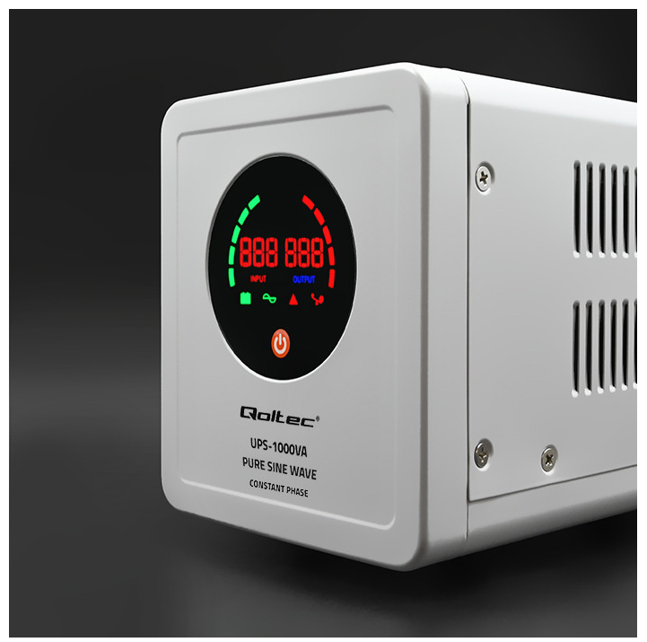 Zasilacze UPS online marki Qoltec tostabilna pozbawiona zakłóceń czysta energia o sinusoidalnym kształcie. To pełna ochrona twoich urządzeń, dziękipodwójnej konwersji, która najpierw przekształca prąd przemienny zasilania sieciowego na prąd stały, a następnie na prąd przemienny, cozapewnia najwyższy poziom jakości zasilania i zabezpiecza przez potencjalnymi zakłóceniami w sieci takimi jak spadki napięcia, zaniki energii, przepięcia i awarie.