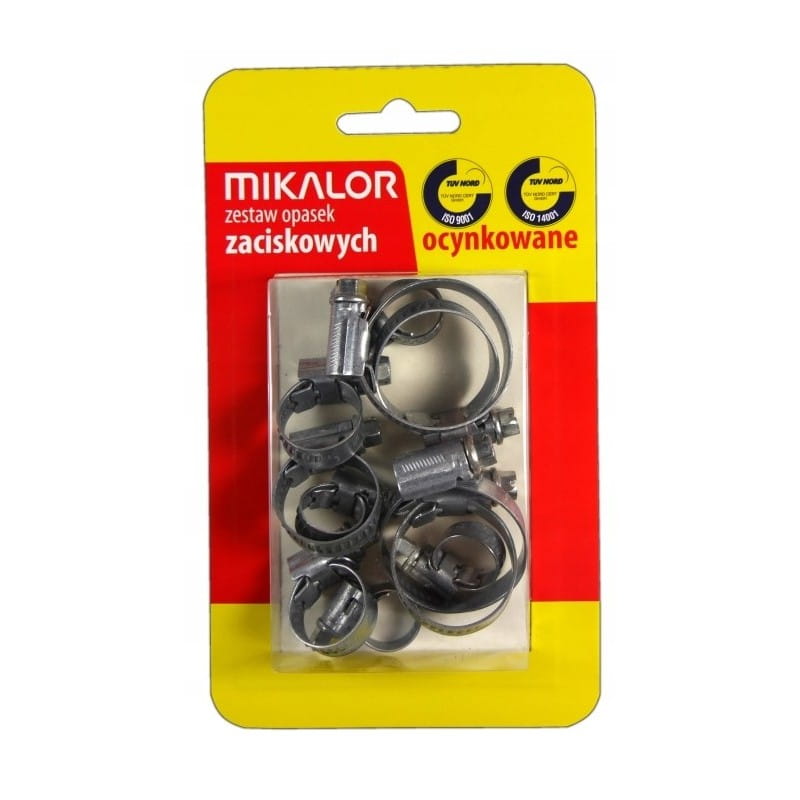 Zestaw opasek zaciskowych Mikalor, wykonanych z taśmy stalowej zabezpieczonej antykorozyjnie o szerokości 7,5 oraz 9 mm. Poprzeczna podkładka w celu uzyskania bardziej równomiernego podparcia przy montażu i długotrwałym naprężeniu opaski. Gładka od wewnątrz powierzchnia chroni węże przed przecięciem i roztarganiem. Unikalny projekt śruby i asymetryczna osłona zwiększają odporność rolki osłony i pomagają uzyskać jednakową szczelność na całym obwodzie. Zestaw zawiera: 4 x 8-12/7.5 mm 2 x 8-16/9 mm 1 x 12-22/9 mm 2 x 16-27/9 mm 2 x 20-32/9 mm